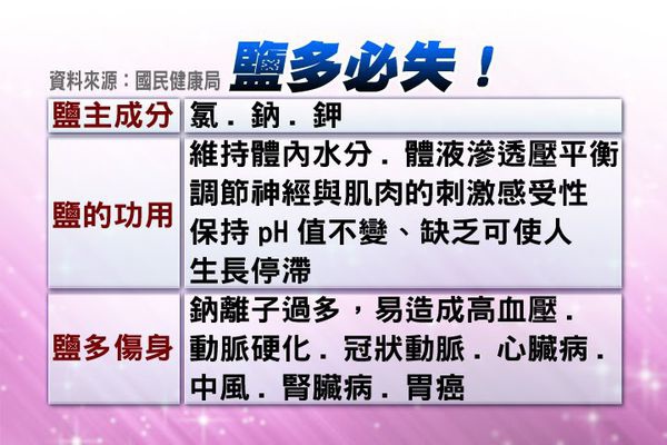 鈉在身體裡佔有一定的功能性,缺它不可!但根據國人的飲食習慣咱們只有『過量』的問題