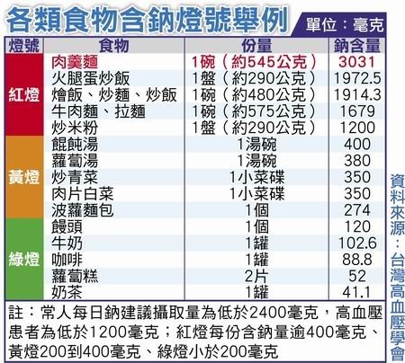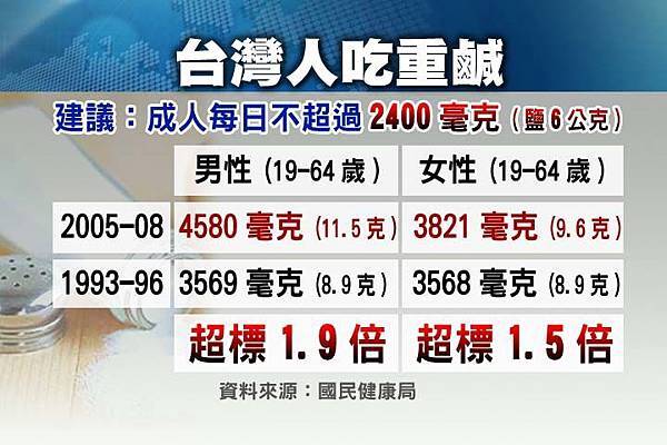 台灣建議(2400毫克/天)已經算是較寬鬆的比例,比世界衛生組織(2000毫克/天)的攝取量標準還要多